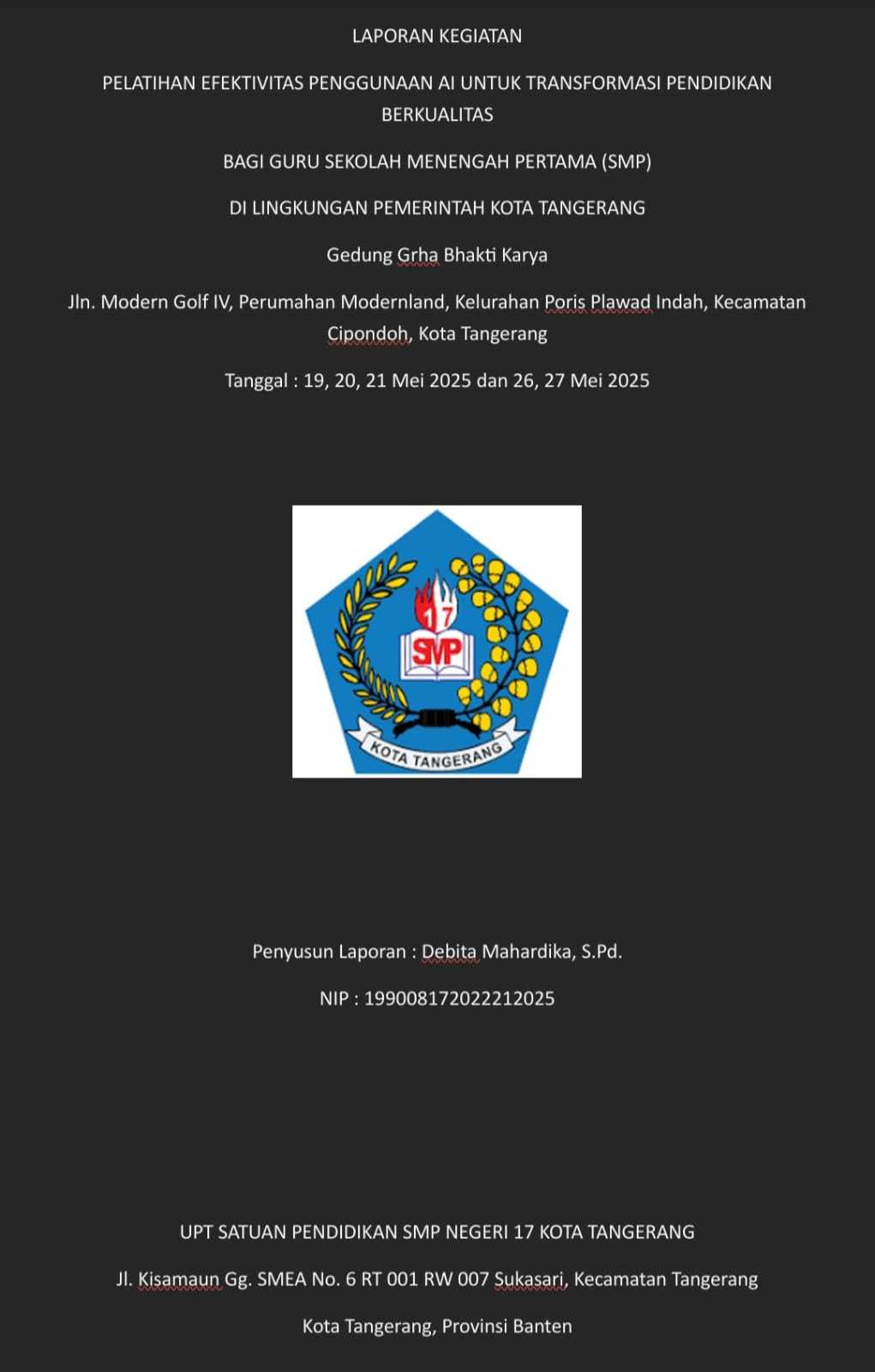 LAPORAN KEGIATAN PELATIHAN EFEKTIVITAS PENGGUNAAN AI UNTUK TRANSFORMASI PENDIDIKAN BERKUALITAS DI LINGKUNGAN PEMERINTAH KOTA TANGERANG UNTUK GURU SMP