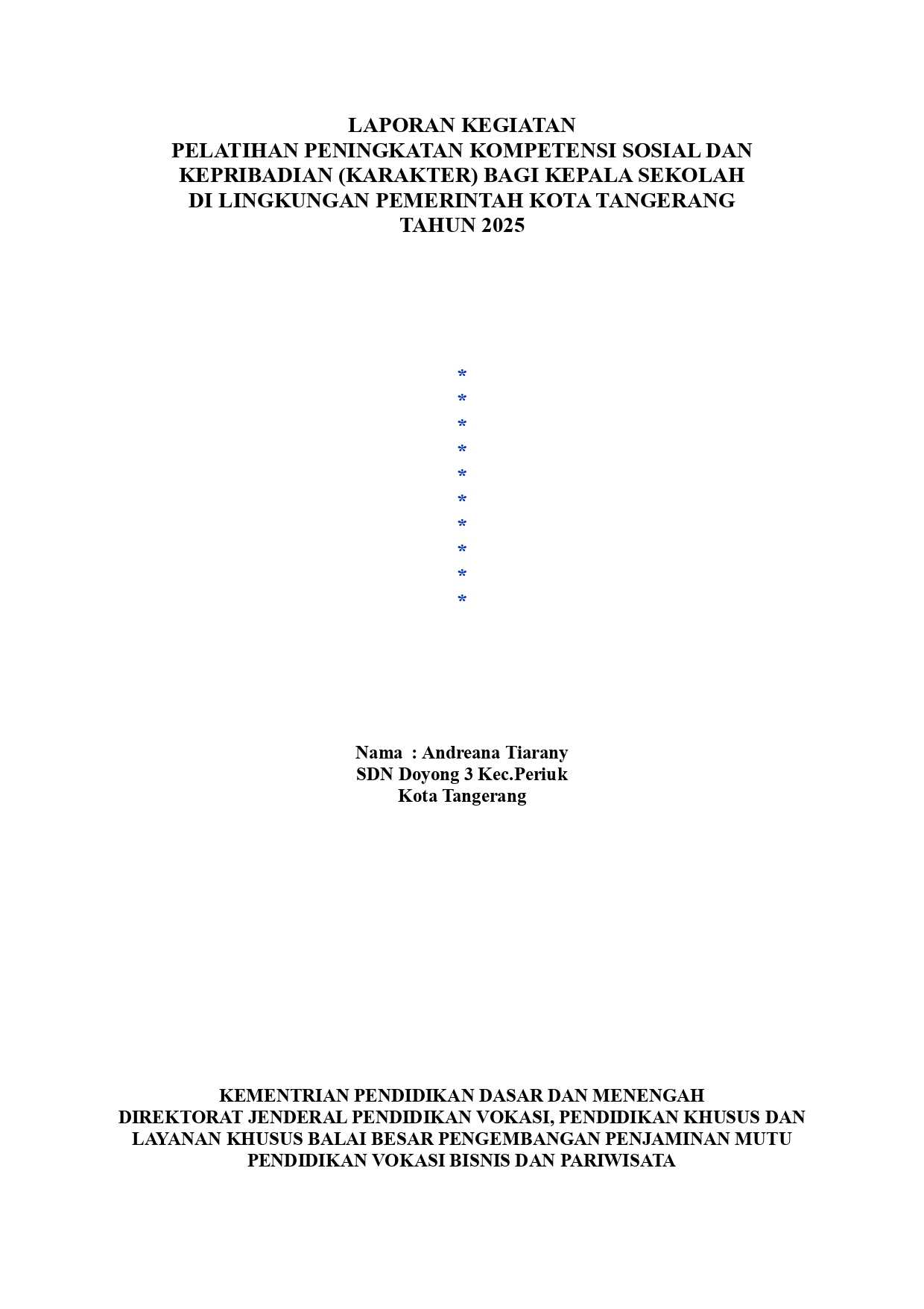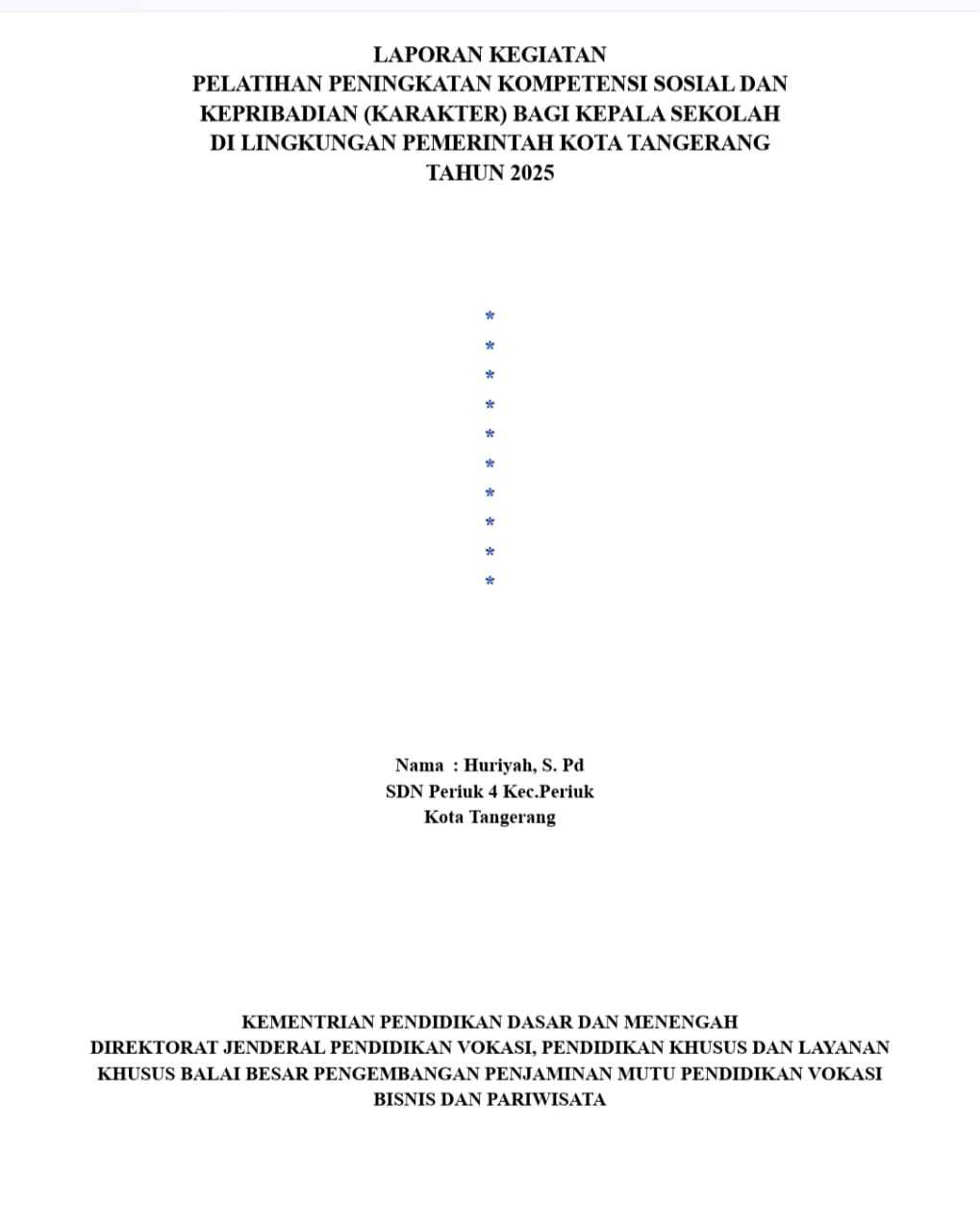 Laporan Pelatihan Kompetensi Sosial dan Kepribadian ( karakter ) bagi kepala sekolah kota Tangerang ini berisikan kegiatan - kegiatan pelatihan selama lima hari ( diskusi, presentasi, stimulasi dan fhoto kegiatan…